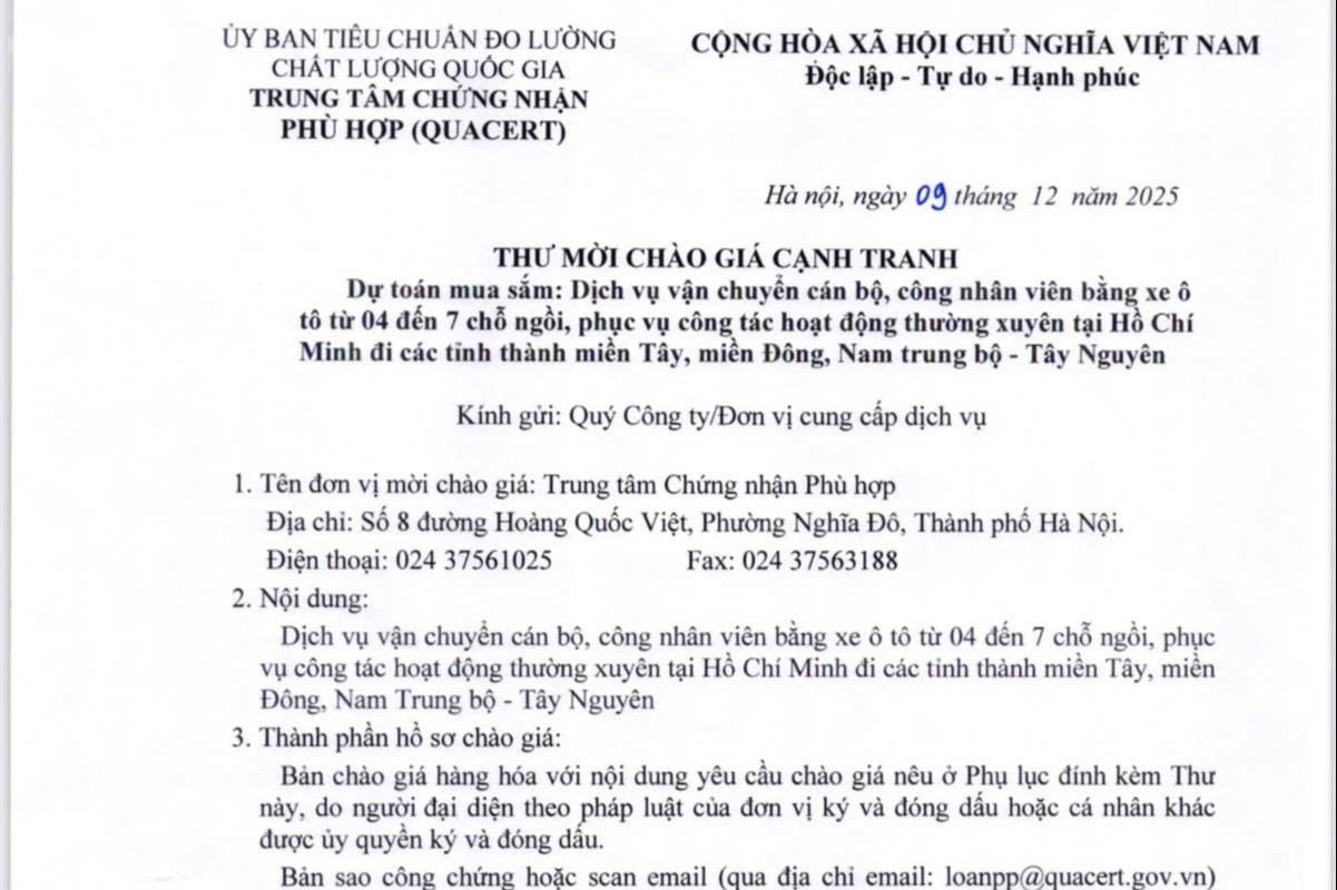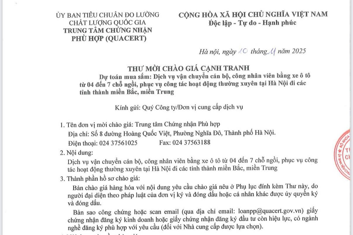 Căn cứ kế hoạch mua sắm năm 2025, Trung tâm mời các công ty, đơn vị có năng lực, kinh nghiệm cung cấp dịch vụ vận chuyển cán bộ, công nhân viên bằng xe ô tô từ 4 đến 7 chỗ ngồi, phục vụ công tác hoạt động thường xuyên tại Hà Nội và các tỉnh thành miền Bắc, miền Trung, tham gia chào giá cạnh tranh.