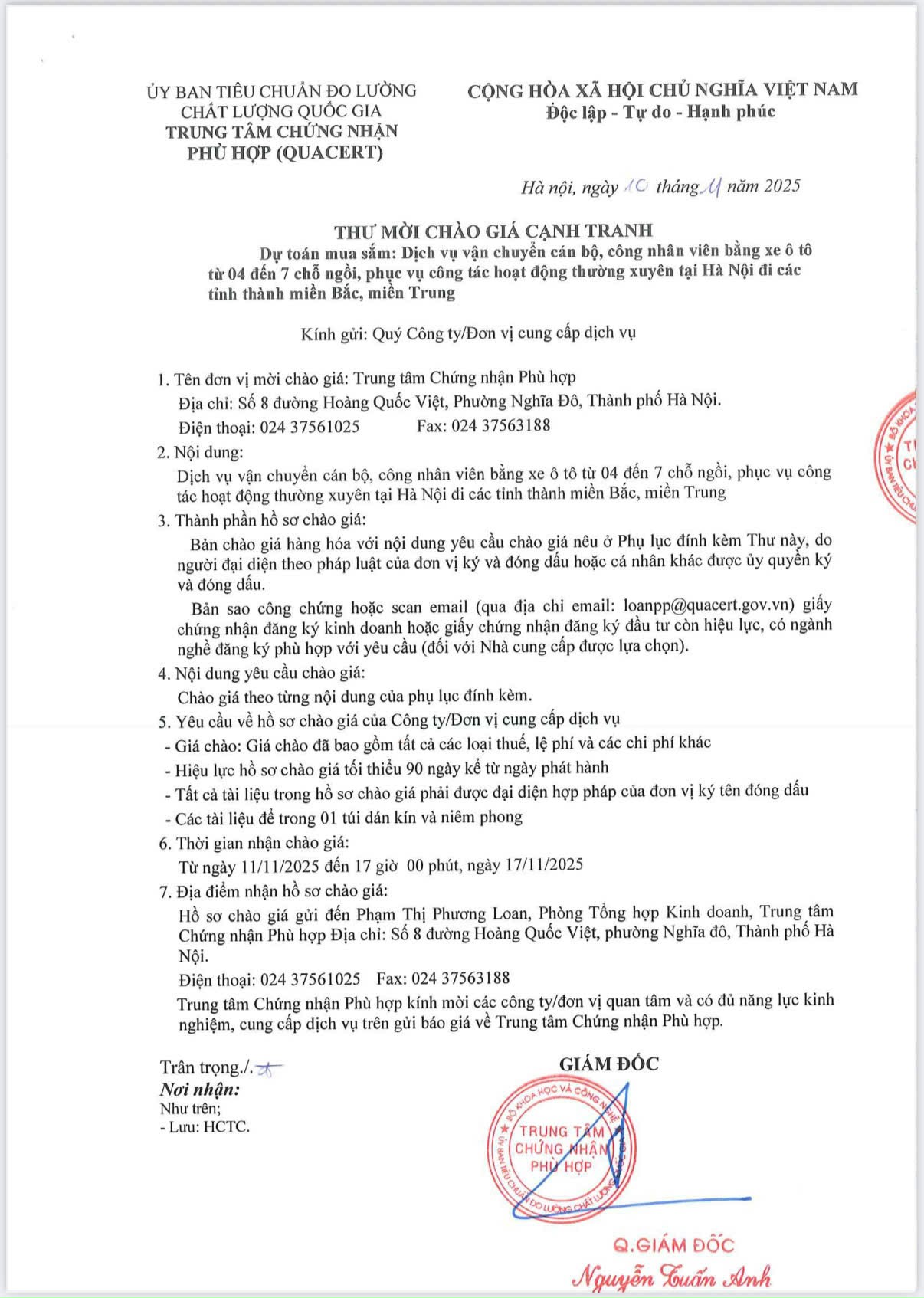 Trung tâm Chứng nhận Phù hợp kính mời các đơn vị quan tâm gửi hồ sơ chào giá theo quy định.