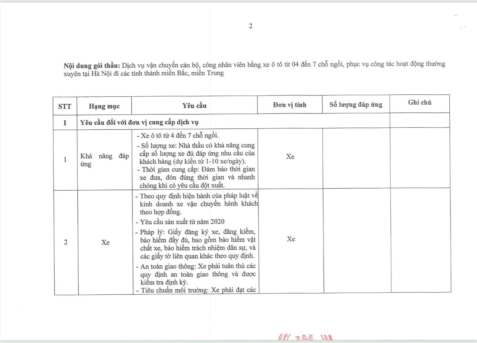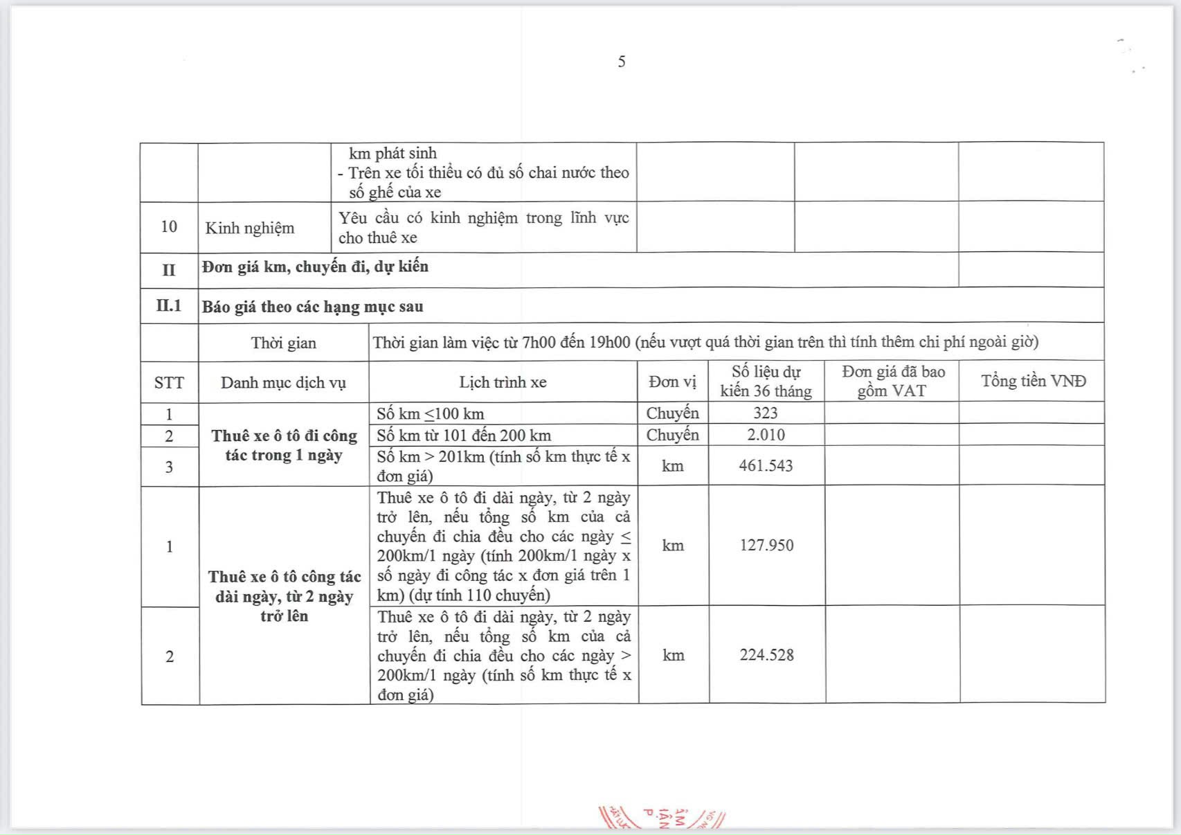 Căn cứ kế hoạch mua sắm năm 2025, Trung tâm mời các công ty, đơn vị có năng lực, kinh nghiệm cung cấp dịch vụ vận chuyển cán bộ, công nhân viên bằng xe ô tô từ 4 đến 7 chỗ ngồi, phục vụ công tác hoạt động thường xuyên tại Hà Nội và các tỉnh thành miền Bắc, miền Trung, tham gia chào giá cạnh tranh.
