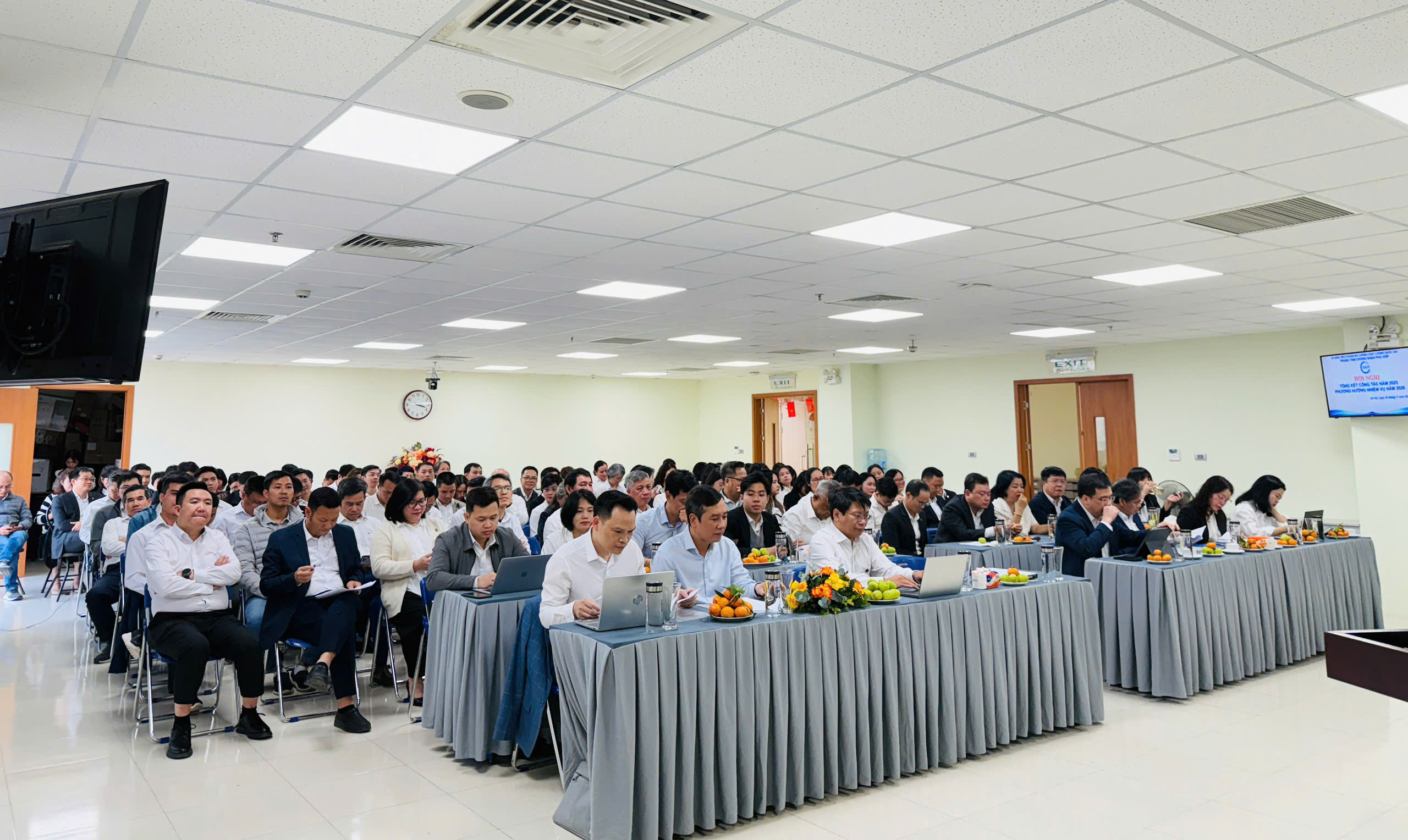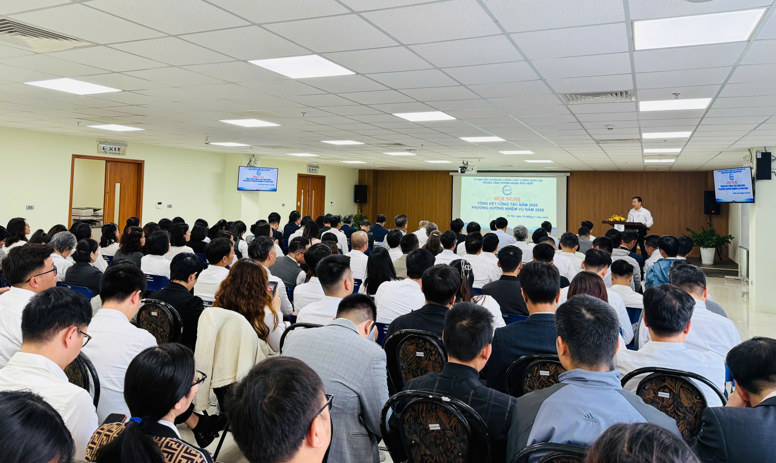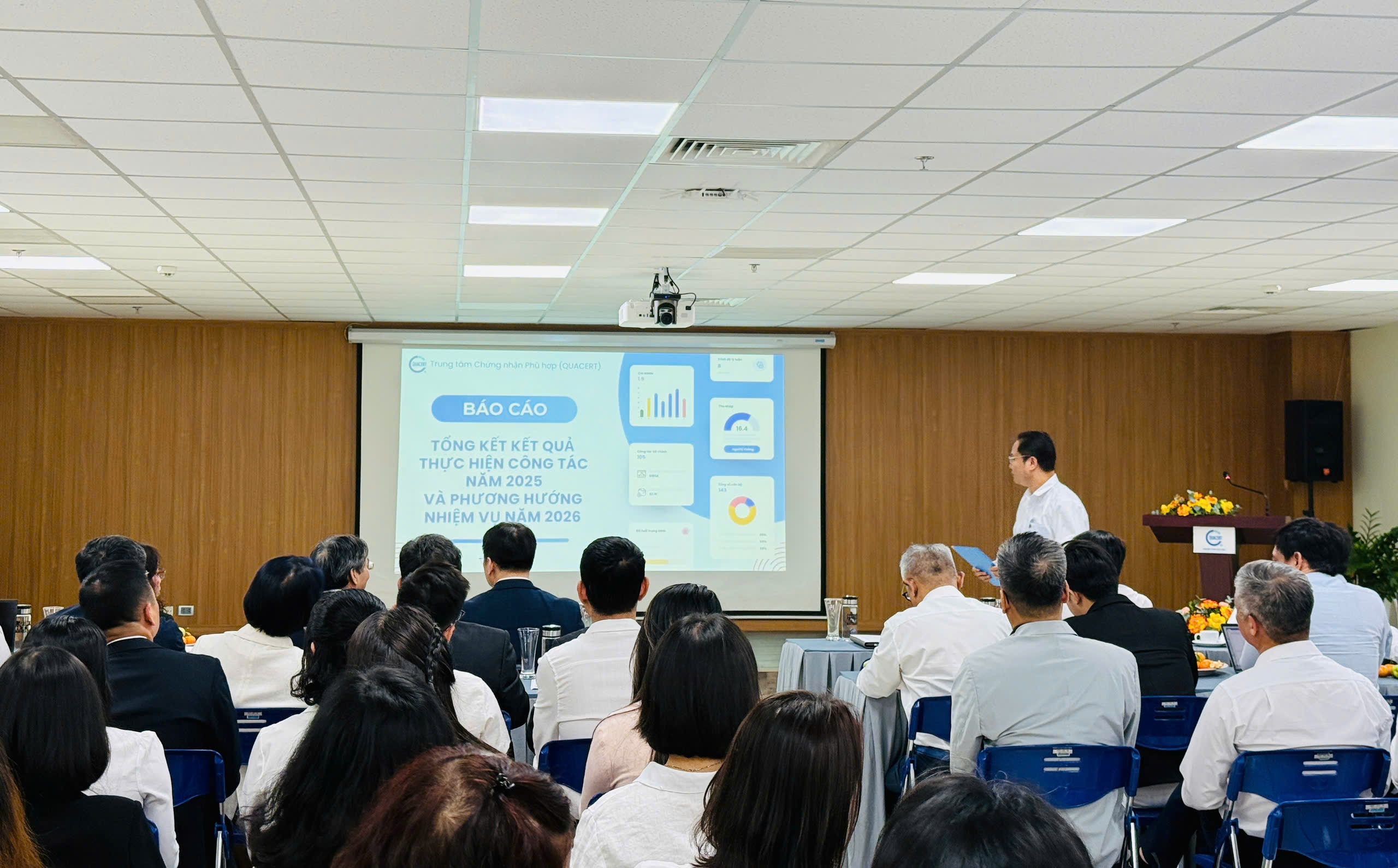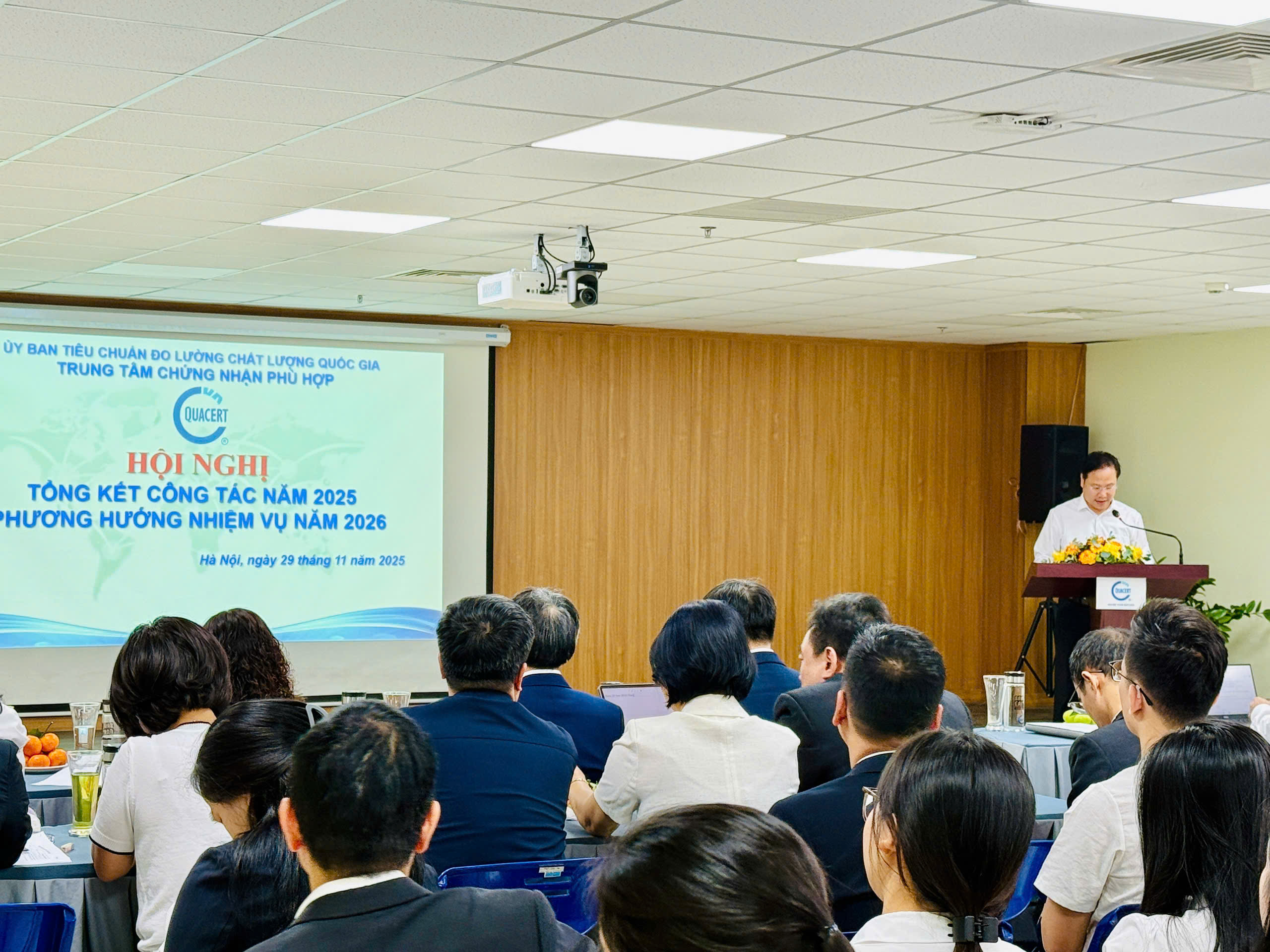 Ngày 29/11/2025, tại tầng 5 Nhà B, Trung tâm Chứng nhận Phù hợp (QUACERT) tổ chức Hội nghị tổng kết công tác năm 2025, phương hướng nhiệm vụ năm 2026 kết hợp Hội nghị viên chức, người lao động với sự tham dự đông đủ của tập thể cán bộ, viên chức và người lao động.
