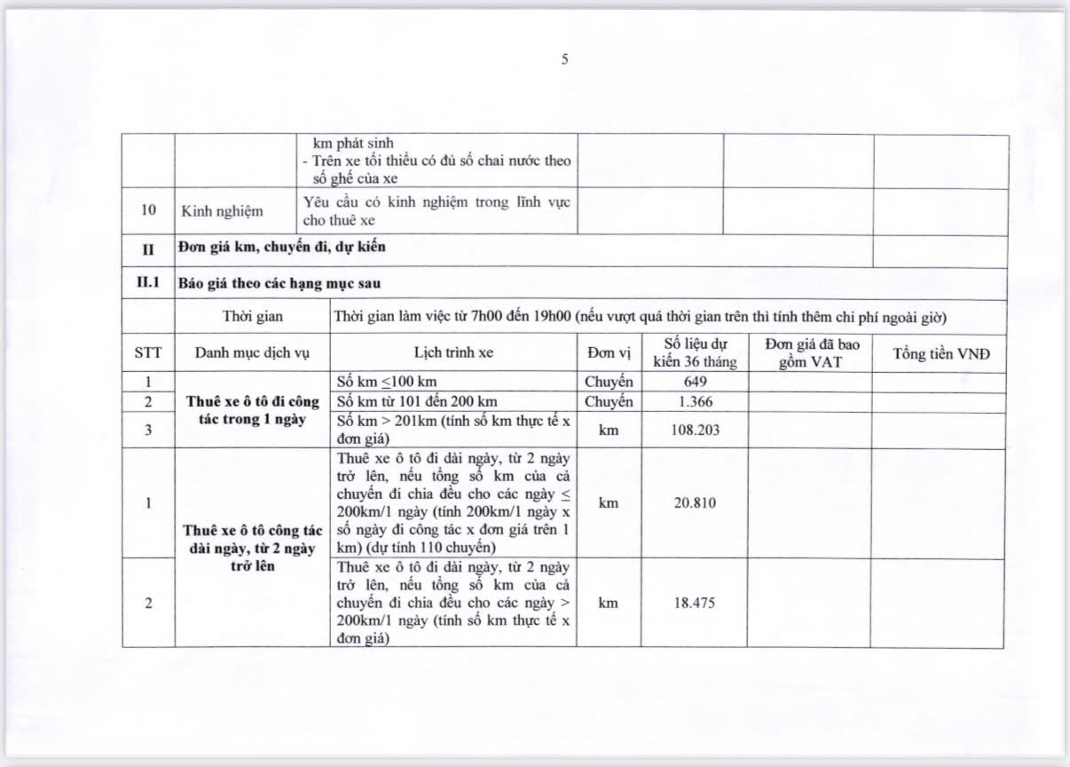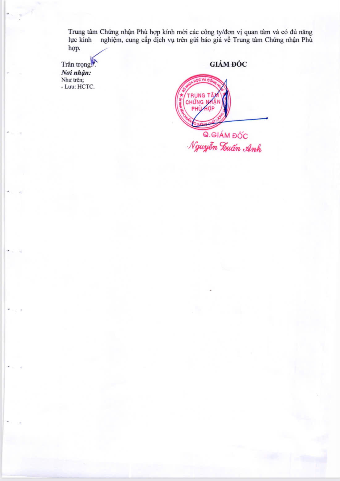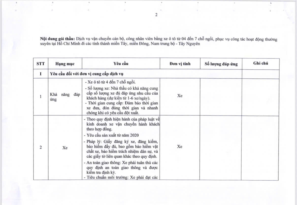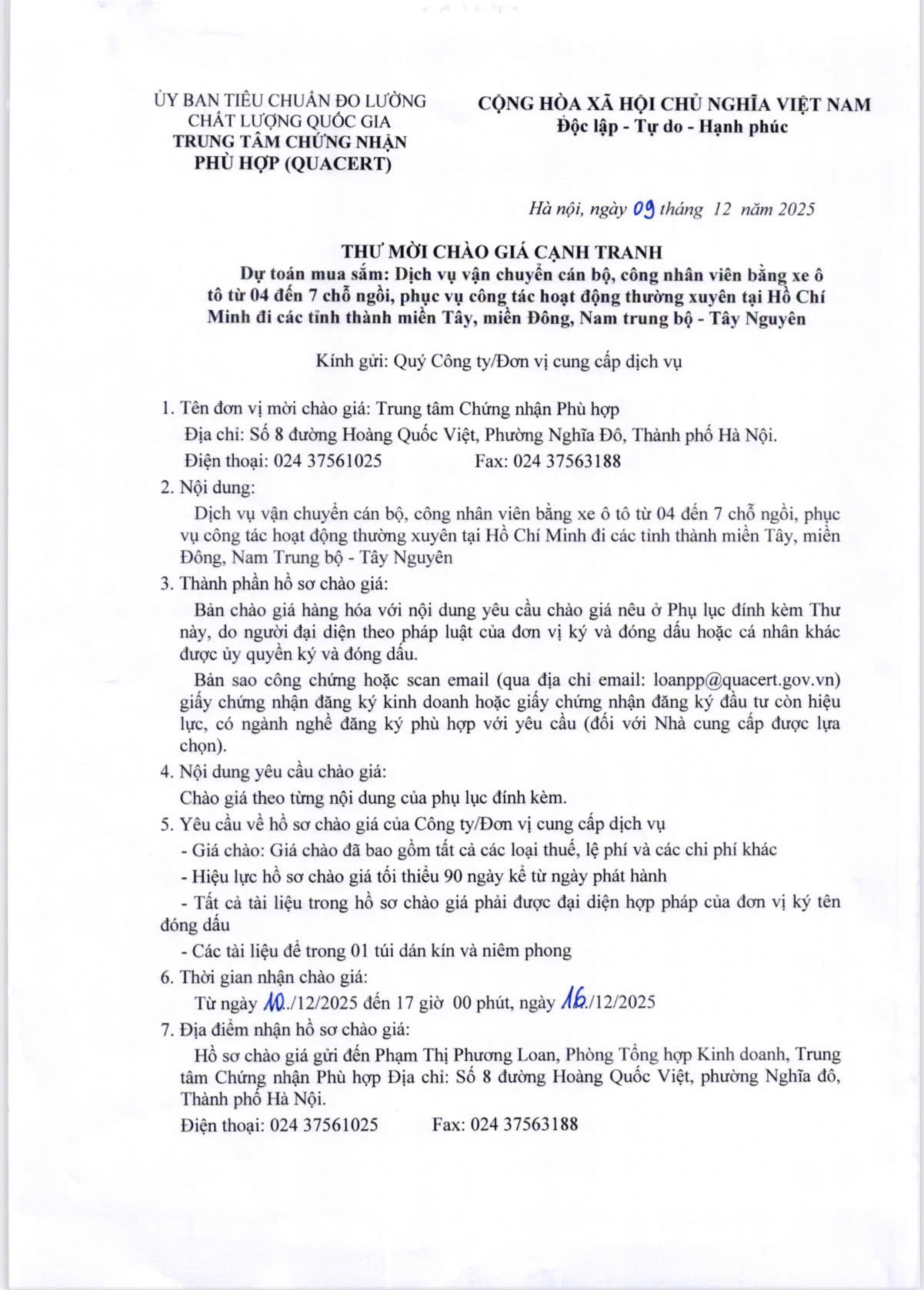 Trung tâm Chứng nhận Phù hợp (QUACERT) xin trân trọng gửi tới Quý Công ty/Đơn vị cung cấp dịch vụ thư mời chào giá cạnh tranh dịch vụ vận chuyển cán bộ, công nhân viên bằng xe ô tô từ 04 đến 7 chỗ ngồi, phục vụ công tác hoạt động thường xuyên tại Hồ Chí Minh đi các tỉnh thành miền Tây, miền Đông, Nam Trung Bộ- Tây Nguyên.
