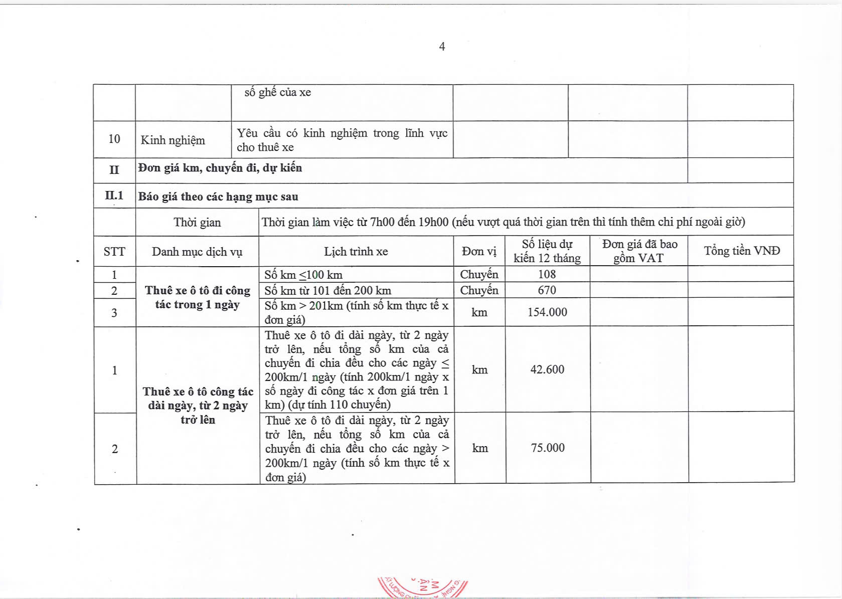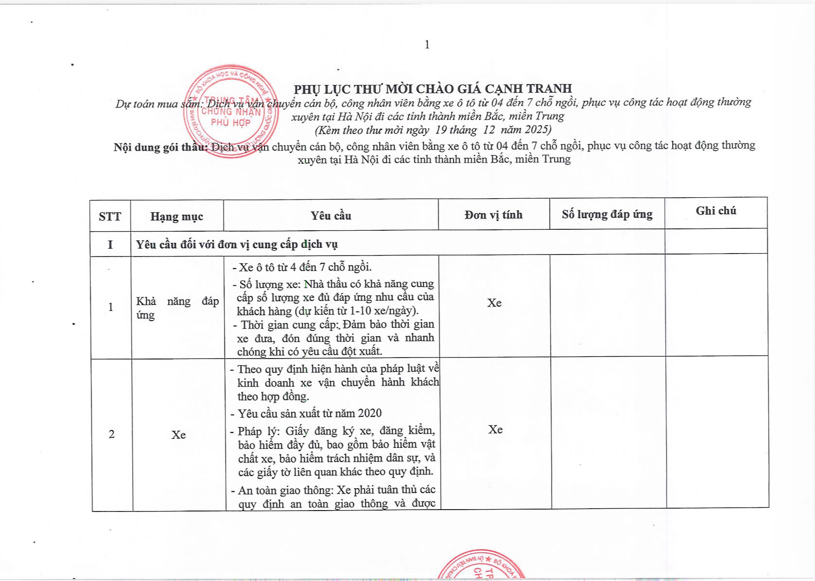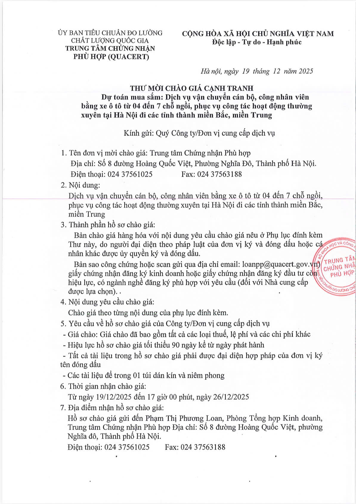 Trung tâm Chứng nhận Phù hợp (QUACERT) trân trọng thông báo mời chào giá cạnh tranh đối với dịch vụ vận chuyển cán bộ, công nhân viên bằng xe ô tô từ 04 đến 07 chỗ ngồi, phục vụ công tác hoạt động thường xuyên từ Hà Nội đi các tỉnh thành miền Bắc và miền Trung.