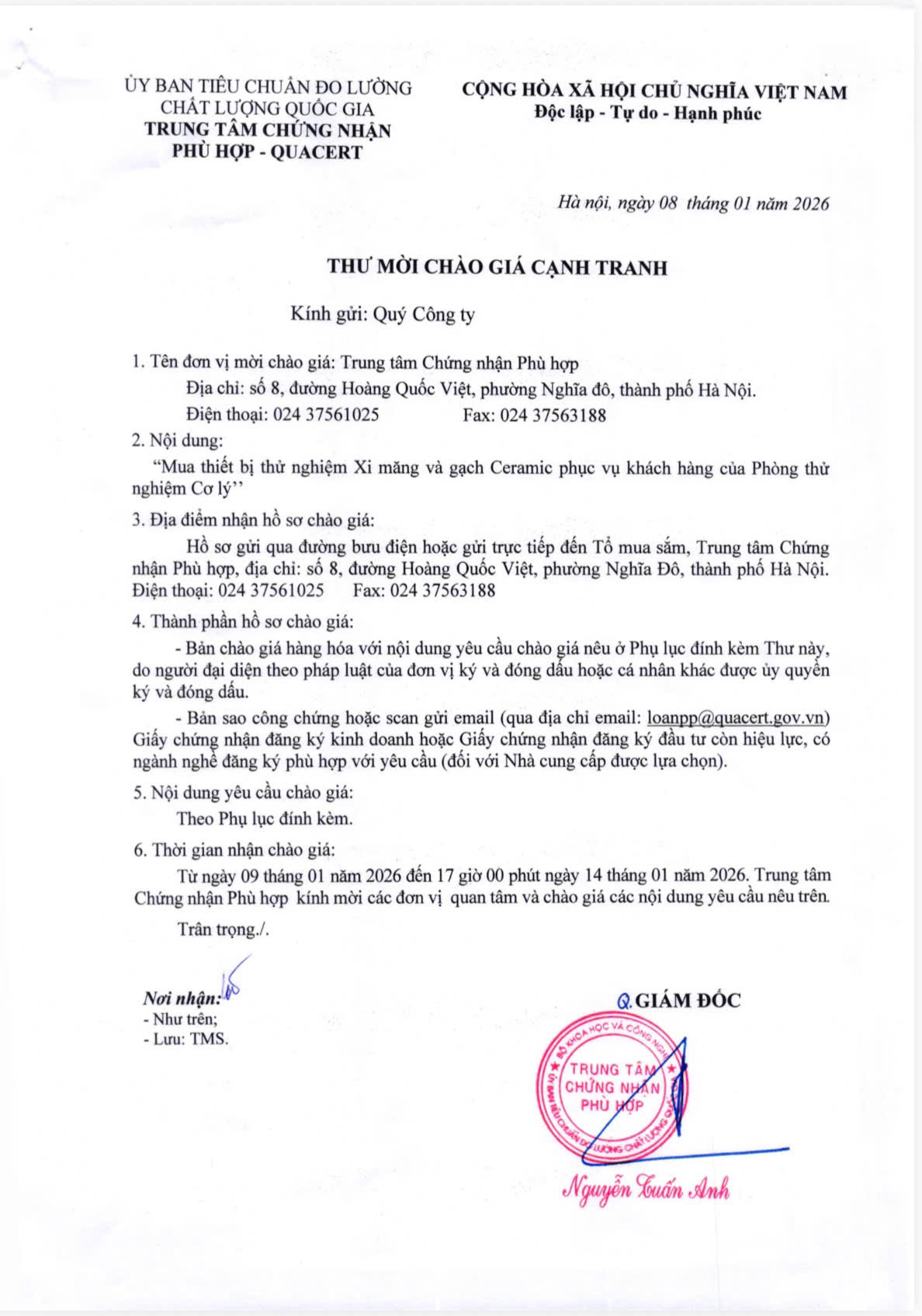 Hồ sơ chào giá được gửi qua đường bưu điện hoặc nộp trực tiếp tại Tổ mua sắm – Trung tâm Chứng nhận Phù hợp (QUACERT), địa chỉ: Số 8 đường Hoàng Quốc Việt, phường Nghĩa Đô, thành phố Hà Nội.