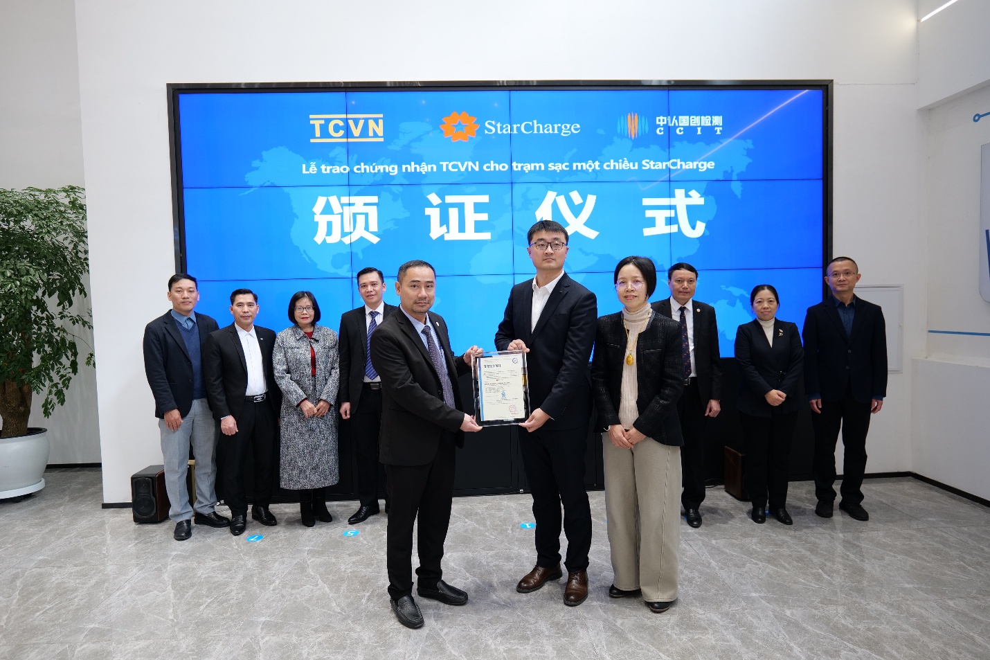 Ngày 27/01/2026 tại thành phố Thường Châu, tỉnh Giang Tô, Trung Quốc, Trung tâm Chứng nhận Phù hợp (QUACERT) đã trao Giấy chứng nhận phù hợp Tiêu chuẩn Việt Nam (TCVN) cho sản phẩm trạm sạc điện một chiều dùng cho xe điện (Trạm sạc DC) mang thương hiệu StarCharge. Đây là sự kiện đánh dấu bước tiến mới trong việc chuẩn hóa hạ tầng trạm sạc xe điện tại Việt Nam.