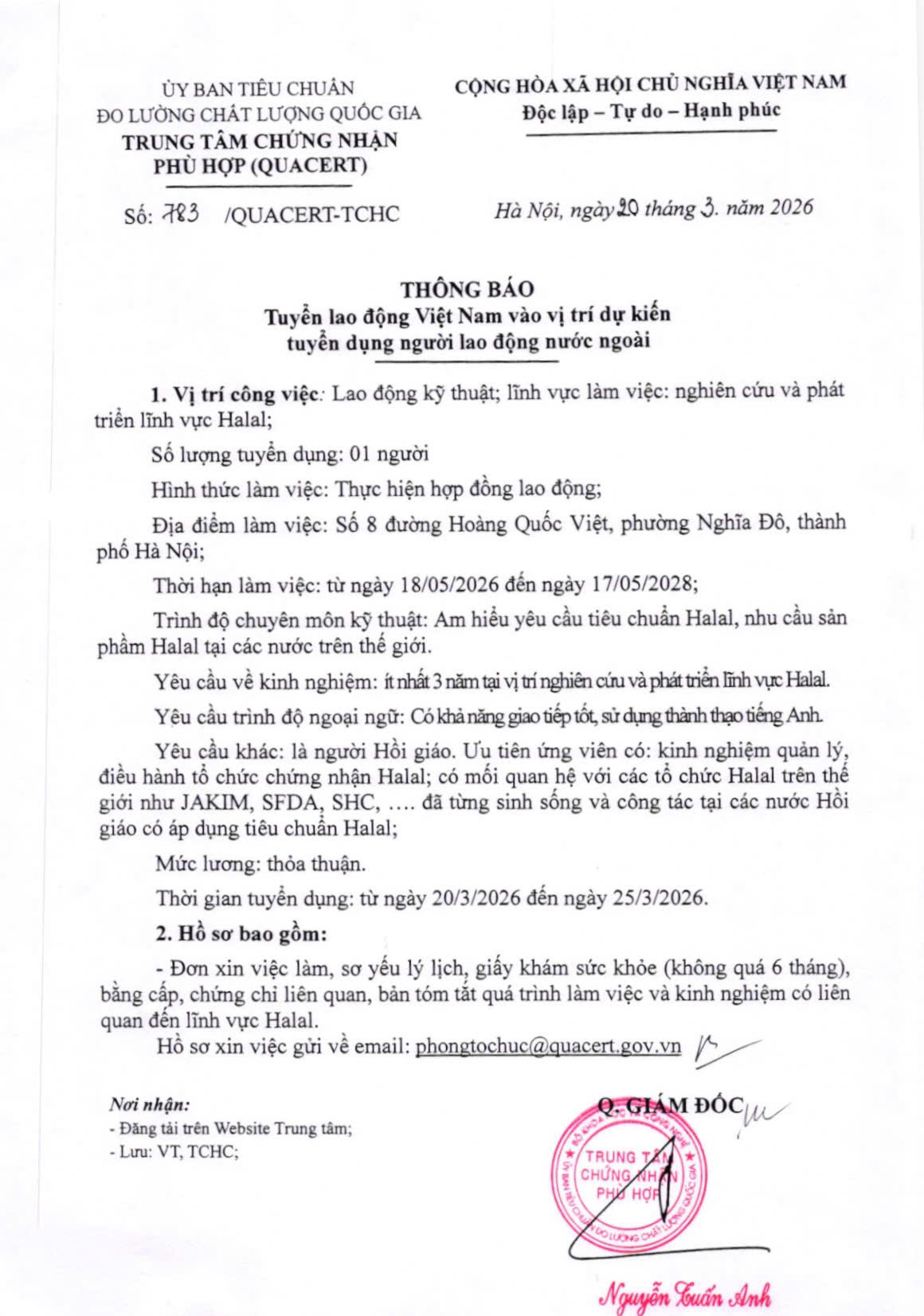 Hồ sơ gửi về email: phongtochuc@quacert.gov.vn Trung tâm Chứng nhận Phù hợp (QUACERT) trân trọng thông báo và mong nhận được sự quan tâm của các ứng viên phù hợp.